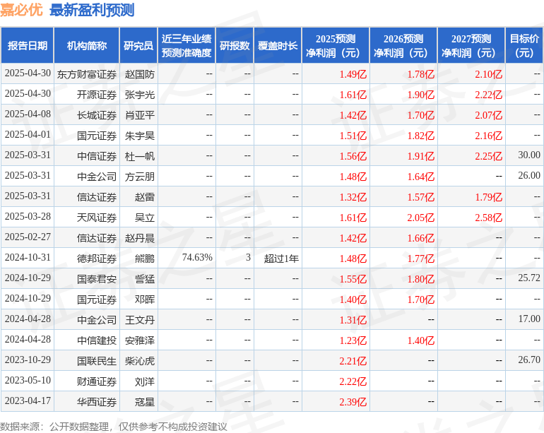 最新盈利预测明细如下: